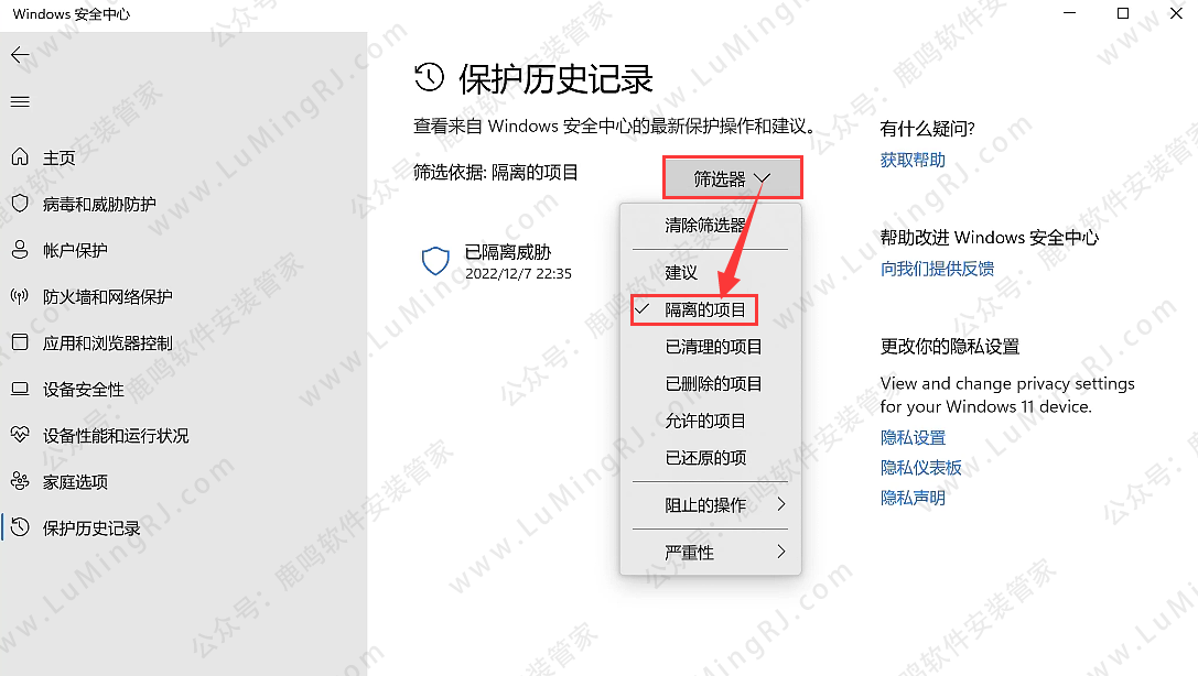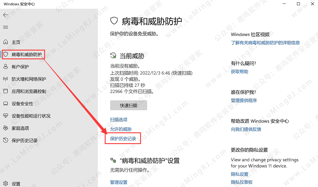 2、点击【病毒和威胁防护】-【保护历史记录】。