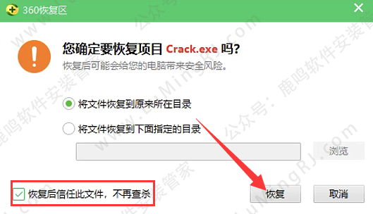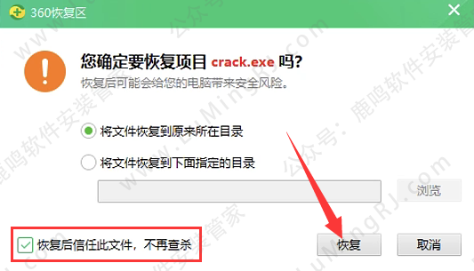 7、勾选【恢复后信任此文件,不再查杀】,点击【恢复】。