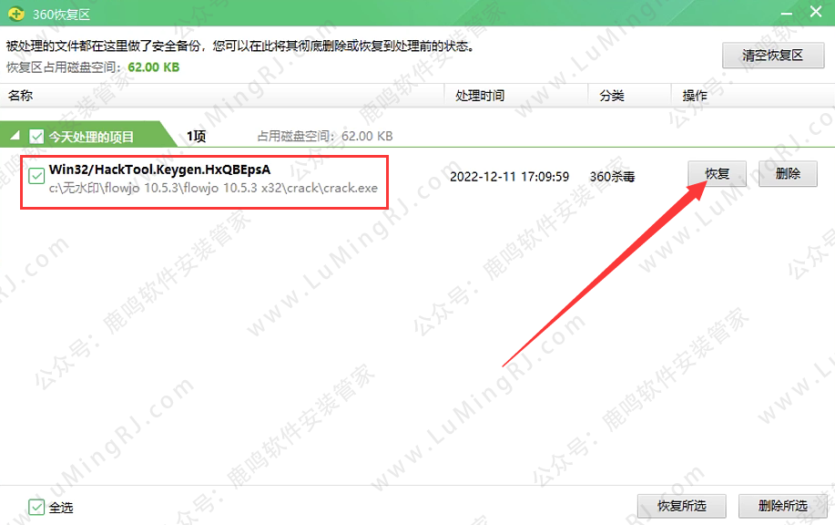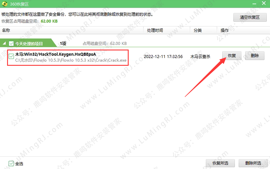 3、勾选【恢复后信任此文件,不再查杀】,点击【恢复】。