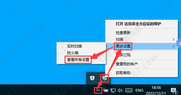 1、电脑右下角,右击【McAfee】图标-【更改设置】-【查看所有设置】。