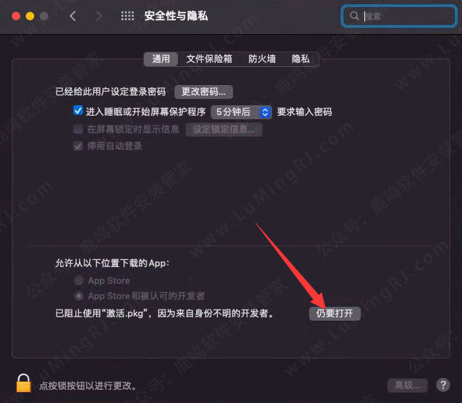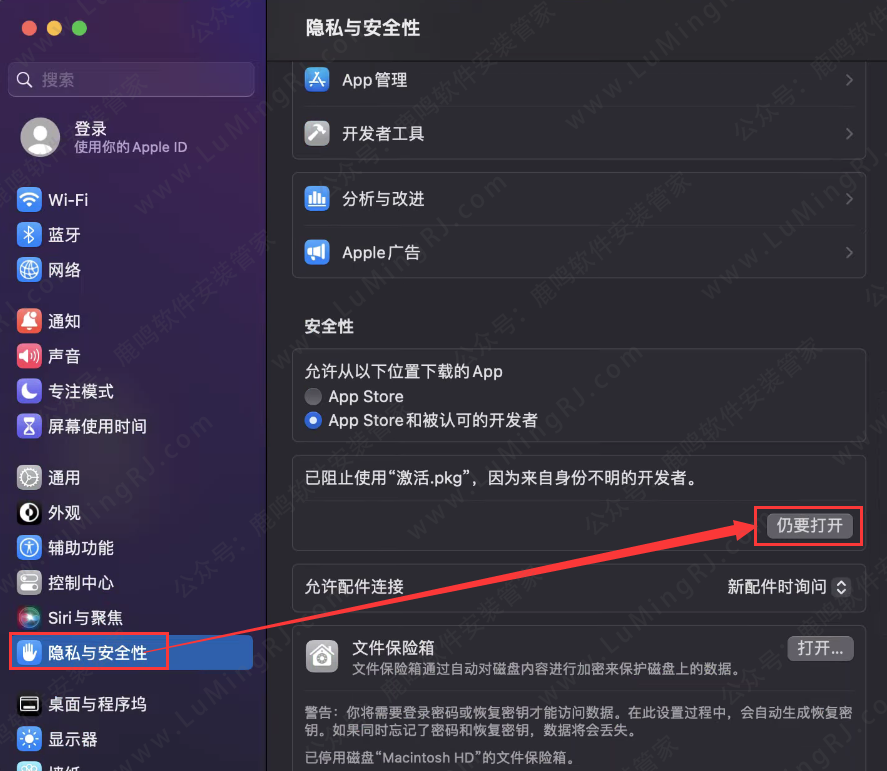 3、在【隐私与安全性】里,点击【仍要打开】。(若弹出密码窗口,输入【开机密码】,点击【解锁】)