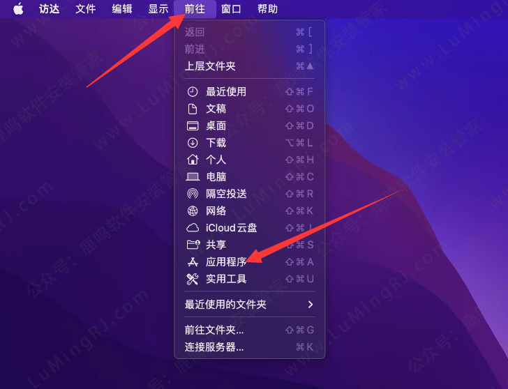 1、电脑最上面的菜单栏上,点击【前往】-【应用程序】。(若没有显示【前往】,在【电脑桌面】上点击一下,上面就会显示了)