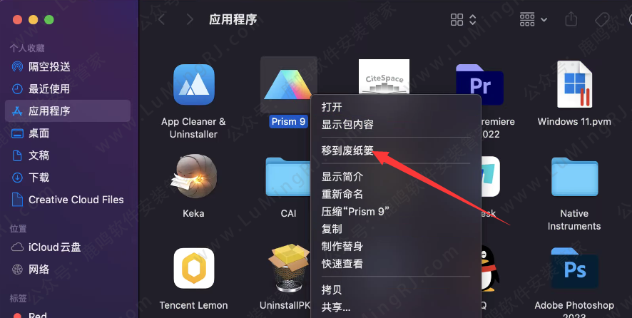 2、右击要卸载的软件,选择【移到废纸篓】即可。