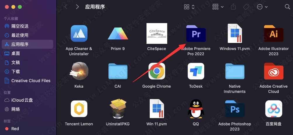 1、在【应用程序】里,双击打开【PR文件夹】。